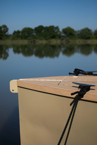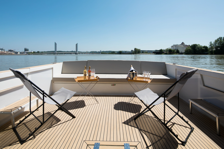 Esprit Garonne dispose donc d’un pont arrière ouvert qui permet d’accueillir la partie apéritive, d’une salle de repas de 12 personnes offrant une vue panoramique, d’une cuisine professionnelle équipée pour produire les repas à bord, d’un poste de pilotage et d’un pont avant ouvert pour profiter pleinement de la vue sur le fleuve.